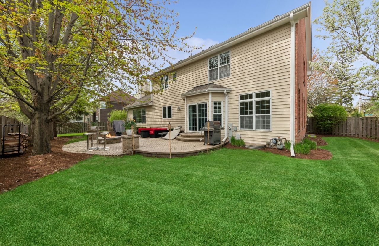 Welcome to 385 N Chalary Court in the prestigious Chestnut Woods subdivision of Palatine. This is your chance to live in a custom-built 5-bedroom, 3.5-bathroom home with a 3-car garage and feeds to the award-winning Fremd High School. With a sprawling 3,341 square feet of finished living space, plus a fully finished basement, this home offers comfort, elegance, and room to grow. Situated on a prime corner lot and East-West exposure, this beautiful home boasts impressive curb appeal with a brick exterior and meticulously maintained landscaped surroundings. Step inside and be greeted by a dramatic two-story foyer and a cascading staircase with newly installed cast iron banisters that immediately sets the tone for the rest of this exquisite home. Featuring 10-foot ceilings, hardwood floors, and a seamless open floor plan, the main level is designed for both everyday living and impressive entertaining. The gourmet kitchen is a chef's dream with a large center island, 42 maple cabinetry, granite countertops, built-in stainless steel appliances, and striking pendant lighting. Sliding patio doors lead out to a large brick-paved patio with a firepit, creating the perfect setting for outdoor gatherings. The family room is a showstopper with vaulted ceilings and a floor-to-ceiling brick fireplace that anchors the space with warmth and style. A formal dining room, private office, guest bath, and laundry room complete the main level. Upstairs, you'll find four generously sized bedrooms and two full baths. The primary bedroom is luxurious with a spa-like ensuite featuring dual vanities, a soaking tub, a separate walk-in shower, and a massive walk-in closet. A bonus unfinished attic space provides an additional 678 square feet to expand or customize into a private enclave. Enjoy entertaining in the fully finished basement featuring a large recreation area, two additional rooms, and a full bathroom-perfect for guests, a gym, or additional office space. Move-in ready with lots of recent improvements, including Trane 96% efficient furnace & AC (2026), roof, washer & dryer (2023), gutters, water heater & dishwasher (2023). Ideally located just minutes from the Palatine Metra station, downtown restaurants, bars, parks, and recreation, this home delivers convenience, community, and an unbeatable lifestyle. Don't miss this rare opportunity to make your forever home in Chestnut Woods.